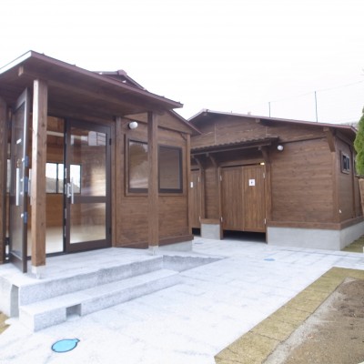 霊園のお客様用トイレ(5.0m×6.0m)として板蔵特注品を現地にて組立施工
